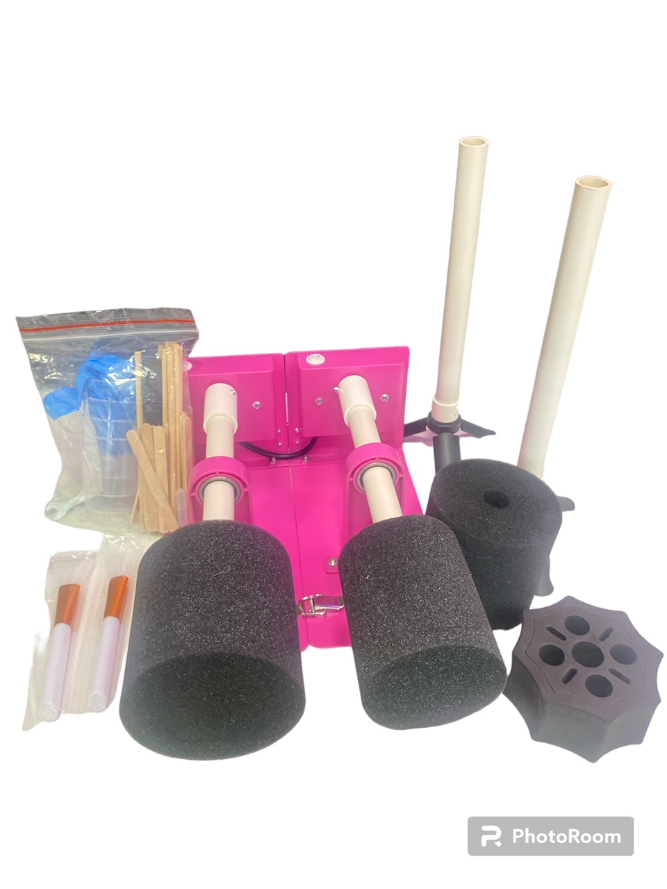 Turner doble para 2 vasos. Incluye 2 parales, matt de silicona, vasitos medidores, paleta de silicona, guantes, paletas de mezcla, 2 sujetadores con tamaños diferentes